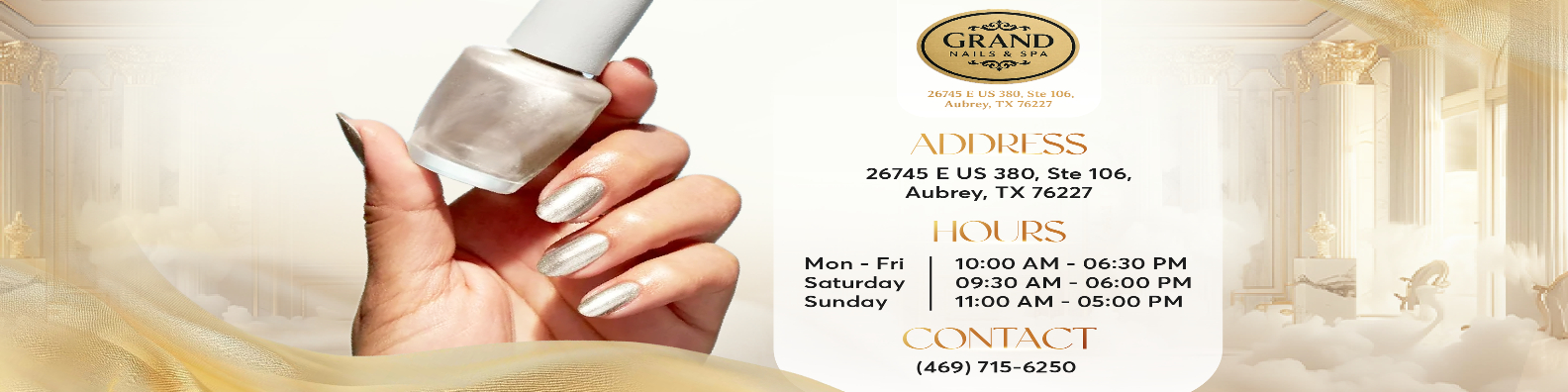 Step into Grand Nails and Spa in Aubrey, TX, and discover your new favorite destination for ultimate relaxation. As a premier nail salon, we are dedicated to providing a serene escape where you can unwind while our expert technicians perfect your look.Our menu of services is designed to cater to every need, whether you're looking for a simple touch-up or a full pampering session. Indulge in our classic and specialty manicures, featuring everything from a flawless polish application to intricate nail art and durable gel extensions. For the perfect finish, our luxurious pedicures are a treat for tired feet, combining soothing soaks, meticulous care, and a relaxing massage. At Grand Nails and Spa, we believe in exceptional service and a tranquil atmosphere to make every visit a truly grand experience.